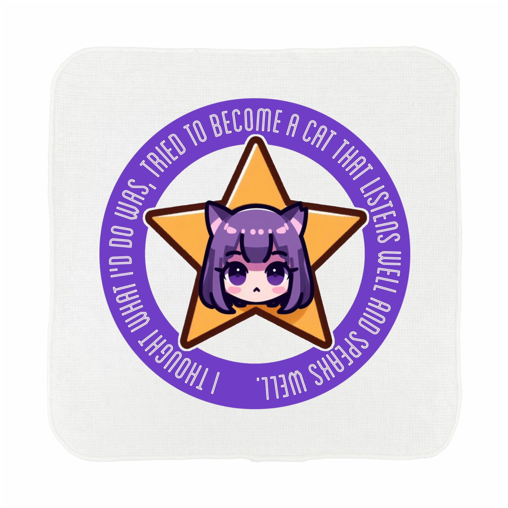 星柿⭐︎猫(ホシガキ マオ)の広告塔になりたい猛者のためだけのTシャツ。『行っくよー!』 右下のLINEマークよりLINE友だち追加して、LINEから『オリジナルグッズを購入しました』と送ってください。 ブランド:泉州タオル 商品名:ムコタオル サイズ:23㎝×23㎝ カラー:ホワイト 素材:綿100% 印刷可能サイズ:18㌢×20㌢ プリント方式:フルカラーインクジェットプリント